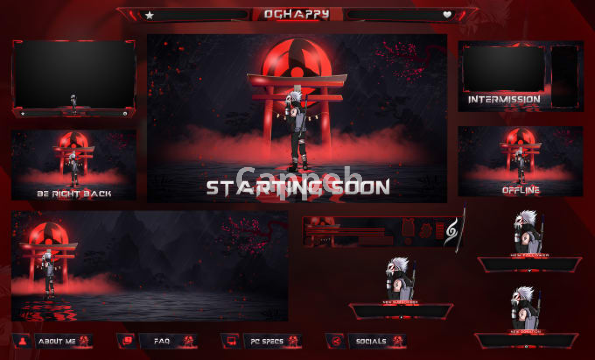 This package includes a Twitch Logo, 6 Screens, 6 Alerts, Facecam Overlay, Bar Overlay, and 10 Panels.