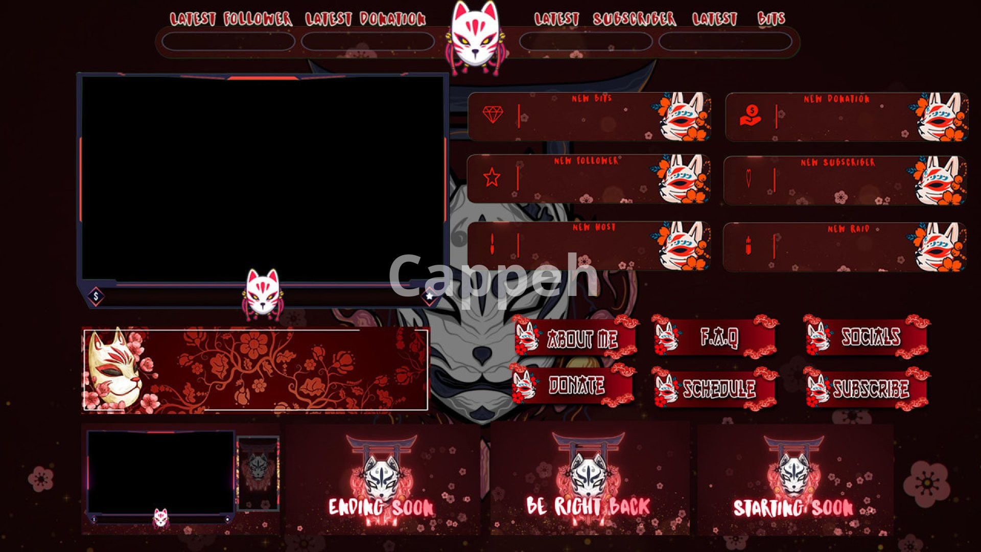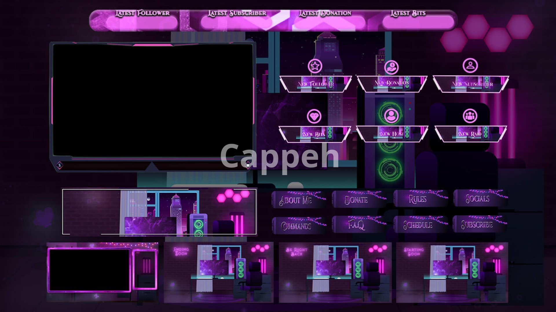 Four animated screens: "Starting Soon," "BRB," "Offline," and "Intermission."
