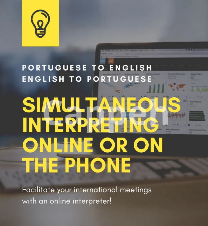 I offer simultaneous interpretation services for Portuguese and English during online conferences or webinars. The service requires a minimum booking of one hour, with the flexibility to add extra hours based on your requirements. Sessions can be conducted via Zoom or any other preferred platform. Please note, I am able to translate for one speaker at a time.