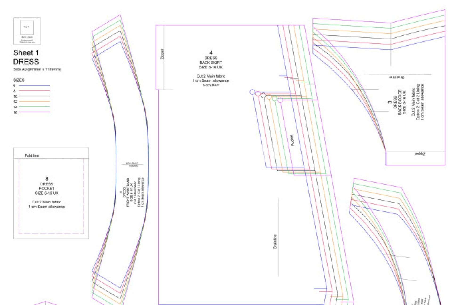 The final product will include annotations like grainline, piece numbers and names, pattern name, notches, and fabric cutting quantities.