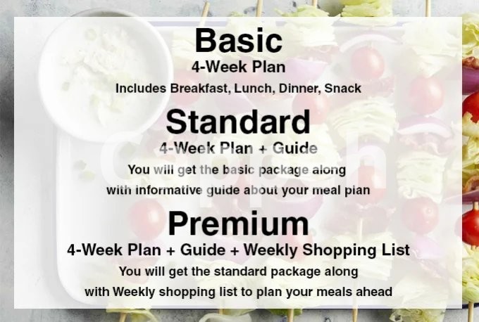 I offer a comprehensive 4-week meal plan tailored for your business, blog, health, or fitness needs.