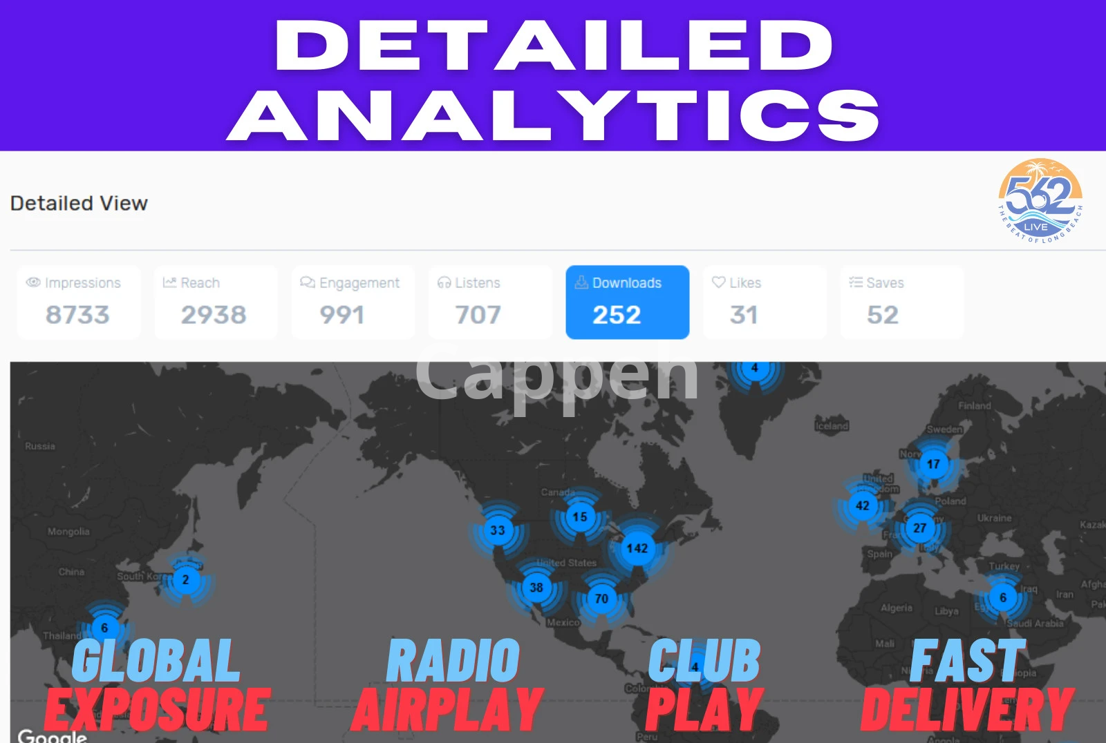 We provide a comprehensive report from the largest network within 3-5 days of submission, featuring analytics on reach, listens, downloads, and geographic insights.