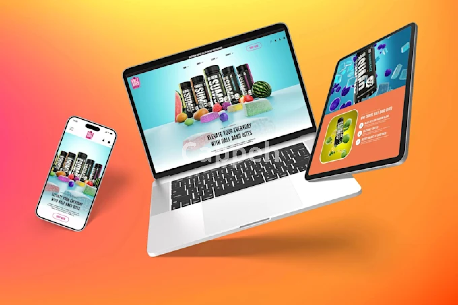 Three mock-ups showcasing the logo in use across media